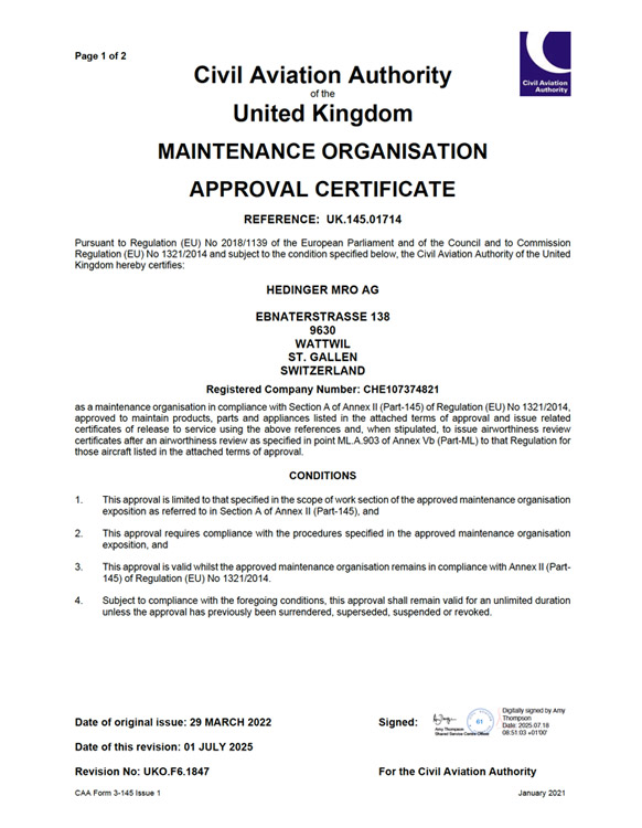 At Hedinger MRO we are proud of our Certificates and Approvals. They reflect our commitment to the highest standards of quality, safety and compliance in aviation maintenance.